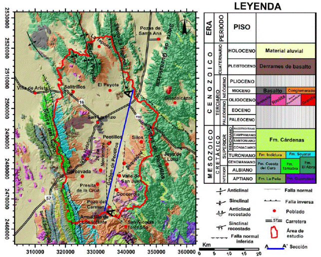 La geología local del área (Figura 2) está representada por: rocas sedimentarias marinas carbonatadas de composición calcárea, arrecifales de la Formación El Abra (Albiano-Cenomaniano), calcáreas-arcillosas con pedernal de la Formación Cuesta del Cura (Albiano-Cenomaniano), arcillo-calcáreas de la Formación Indidura (Turoniano-Santoniano), arcillo-calcáreas carbonosas de la Formación Soyatal (Turoniano-Santoniano), lutitas y areniscas de la Formación Cárdenas (Maastrichtiano-Campaniano).