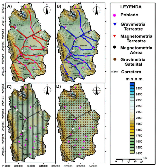 The northeast portion of the basin is characterized by having the lowest values of topographical elevation, as well as lowest density and magnetization values of the different geological units present in the subsoil, linked to the main discharge zone, where the crossing of the NW-SE and N-S fault systems has caused the connection of the Aquifer system of Villa Hidalgo with the Cerritos aquifer system.