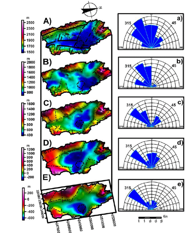 En la configuración de la magnetometría aérea (Figura 5D) los valores de elevación del mapa oscilan en un rango entre -360 a 1290 msnm, infiriéndose que los sistemas de lineamientos NW-SE y NE-SW (Figura 5d) son los de mayor orden, así como los más antiguos, el sistema N-S el de menor orden y el más reciente para esta configuración. Los lineamientos antes mencionados coinciden con regímenes de falla reconocidos en superficie (Figura 5A) y con estructuras de carácter regional como: el cinturón plegado de la Sierra Madre Oriental, el Graben de Arista, Graben de Peotillos, Graben de San Luis, Graben de Villa de Reyes, entre otros. (Labarthe-Hernández, 1982; Barboza-Gudiño et al., 2002; Alaniz-Álvarez y Nieto-Samaniego, 2005; López-Doncel et al., 2007; Tristán-González et al., 2009). Lo anterior indica que la evolución tectónica de la CVH se ha dado en una serie de etapas/pulsos y que el relieve está asociado a una secuencia sedimentaria y volcánica (Triásica-Jurásica).