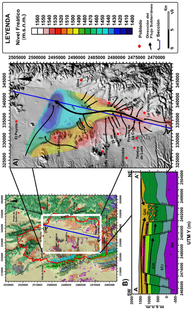 subterránea, mostrando las zonas de recarga localizadas en casi toda la periferia del graben de Peotillos y dirección preferencial S-N (Figura 9A). El agua subterránea se infiltra e interconecta en los diferentes tipos de acuíferos a través de fallas y fracturas del subsuelo, originadas tanto por movimientos extensivos como laterales ocasionando permeabilidad secundaria tanto en las rocas volcánicas como en las rocas sedimentarias del Cretácico presentes en el subsuelo (Figura 9B).