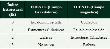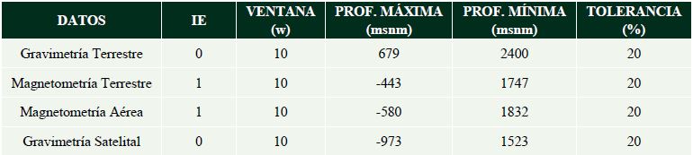 La ventaja de la DE es la de no requerir un modelo geológico previo, sin embargo el IE es el principal parámetro de entrada, el cual implica el conocimiento a priori sobre la geometría de los cuerpos geológicos que generan las anomalías. La elección del IE determina en gran medida las profundidades calculadas. De acuerdo a diversos autores (Reid et al., 1990; Reid et al., 2003; FitzGerald et al., 2004; Hinze et al., 2013) la relación entre geometría de las fuentes e IE se pueden ver en la Tabla 1. Debido a que la geología del área presenta fallas, cabalgamientos y estructuras de buzamiento variable, el IE= 0 para datos gravimétricos e IE= 1 en datos magnéticos resultan ser los más apropiados de acuerdo con la Tabla 1. Las soluciones de Euler se han calculado utilizando los mapas de la anomalía residual de Bouguer de gravimetría terrestre y satelital, así como el CMR de magnetometría terrestre y aérea. Las ventanas utilizadas para los conjuntos de datos fueron de, 10 x 10 puntos (1 x 1 km) y una tolerancia de 20 (error en %). En la Tabla 2 se muestra un resumen de las características y profundidades encontradas para cada conjunto datos.
