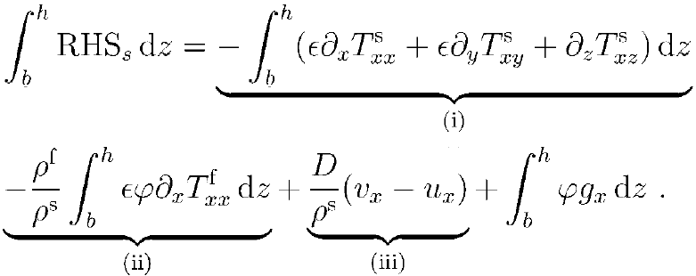 An additional equation is needed to solve for φ . After depth averaging Equation 1, we arrive at the mass balance equations for the solid and fluid phases: