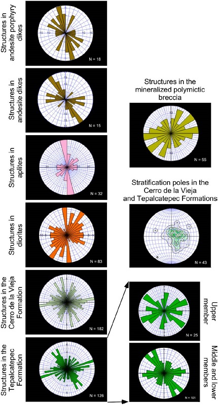 The NE-SW structural domain is the most recent one in the area (Figure 9) and includes the Minatitlán fault and graben. First-order faults in this domain are essentially normal (with a domino geometry) with some strike-slip movement, and second-order sinistral strike-slip faults displaced monzonite dikes. The apparent offset associated with the Minatitlán fault cannot be determined in the absence of a reliable level of reference, but it is estimated to be more than 200 m by using the distribution of the Cerro de la Vieja Formation. Foliation with the same general strike as this domain was found in the disseminated orebody; therefore, this domain clearly postdates the formation of iron oxide bodies. As previously stated, the NE-SW domain is associated with recent structural and seismic activity.