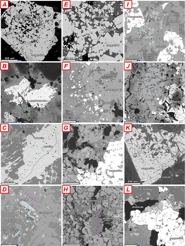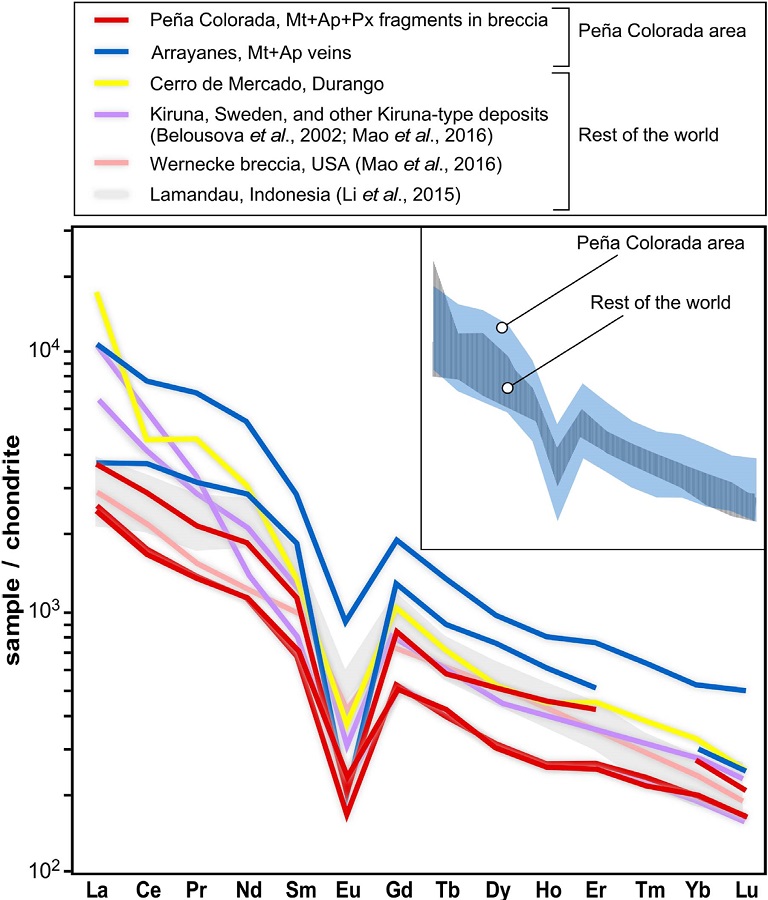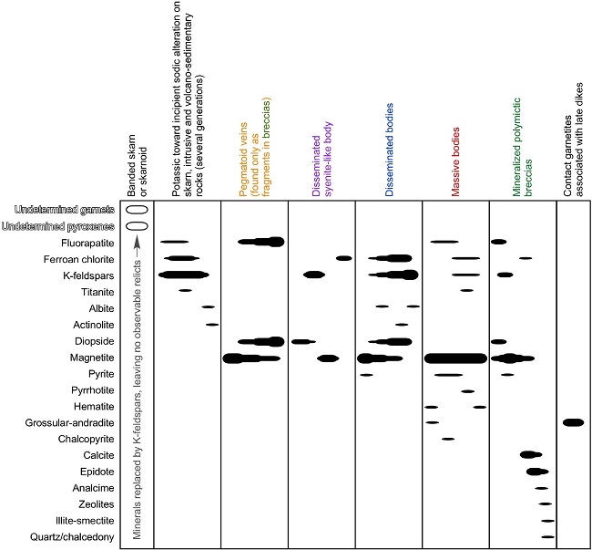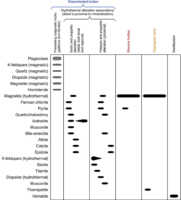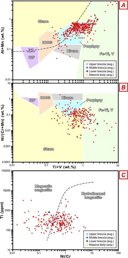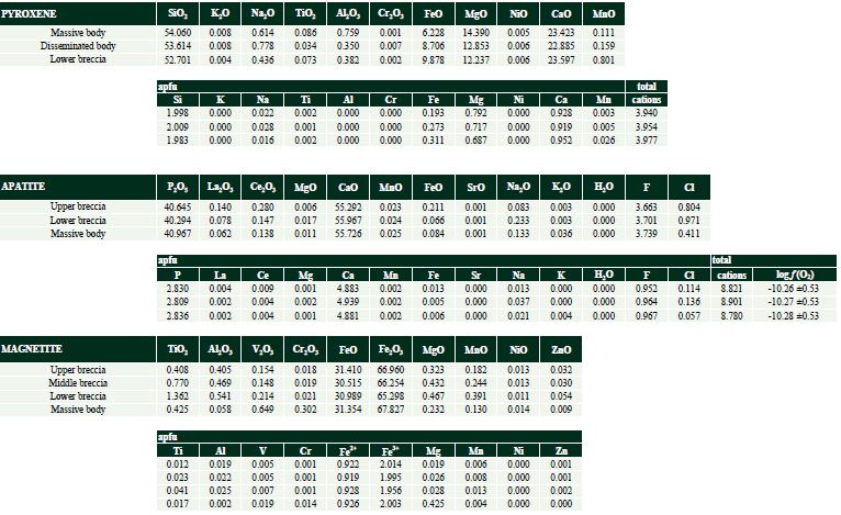 The mineralogy and mineral chemistry of magnetite and fluorapatite in these deposits are compatible with a magmatic-hydrothermal origin under high O2 fugacities, and this deposit shares many geochemical traits with Kiruna-type and other magmatic-hydrothermal iron oxide deposits (MHIO, or IOCG “clan”). REE patterns and ΣLREE and ΣHREE values in fluorapatite of these deposits are typical for Kiruna-type and IOCG deposits. In contrast, the studied deposits differ from the rest of MHIO deposits in their comparatively higher Ti contents in magnetite, and higher Ce contents and lower Eu contents in fluorapatite.