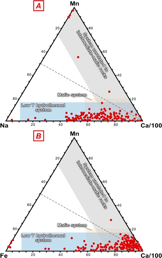 The contents of minor metals in apatite (Figure 12) plot in the area of overlap of the low temperature hydrothermal system, the mafic system, and the system unrelated to intermediate-mafic rocks, as defined by Piccoli and Candela (2002), with outliers in the latter and the hydrothermal systems. However, almost all concentrations plot in the low-temperature hydrothermal system. The content of minor metals in magnetite (Figure 11) plots astride the fields of magmatic and hydrothermal magnetite and, rather inconclusively, is widely spread across the compositional fields of porphyry, skarn, Fe-Ti-V, Kiruna-type, and IOCG deposits (as of Dupuis and Beaudoin, 2011; Dare et al., 2012; Nadoll et al., 2014).