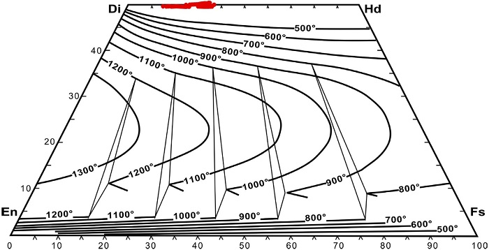 IOA ore bodies are similar in the Peña Colorada and Arrayanes deposits, as both contain subhorizontal massive and disseminated magnetite bodies, massive magnetite veins, “pegmatoid” magnetite + fluorapatite ± diopside veins, and breccias. “Pegmatoid” magnetite + fluorapatite ± diopside associations are common in IOCG “clan” deposits and are associated with relatively high temperatures (e.g., El Laco in Chile; Naslund et al., 2002), although the analyzed diopsides in Peña Colorada would not yield temperatures greater than aproximately 300 °C (Figure 13). As discussed in sections 6.3 and 6.4, all the events of mineralization in the Arrayanes prospect may correspond genetically and temporally to the main event of mineralization in the Peña Colorada deposit, based upon structural, mineralogical, and geochronological criteria.