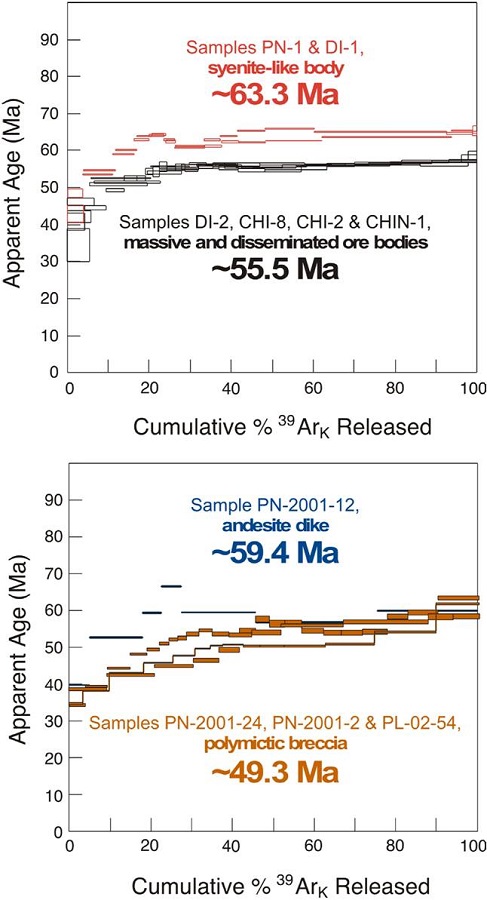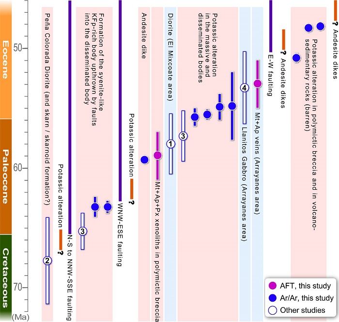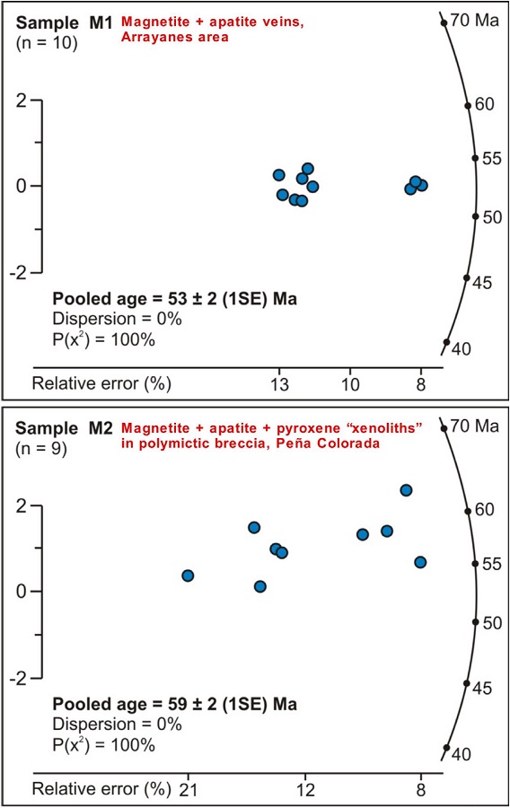 The formation of iron oxide deposits in the study area (latest Cretaceous to earliest Eocene in age) spans at least approximately 19 to 23 Myr (67.6 ± 3.5 to 48.18 ± 0.30 Ma), as revealed by extensive 40Ar/39Ar and AFT dating. The main stage of mineralization at Peña Colorada was dated at approximately 55 Ma. The total age span for the formation of this deposit, however prolonged, is not an exception for sizeable ore deposits of this kind. However, the likeliest range of ages for formation of the Arrayanes prospect would reasonably be 54.84 to 50.70 Ma.