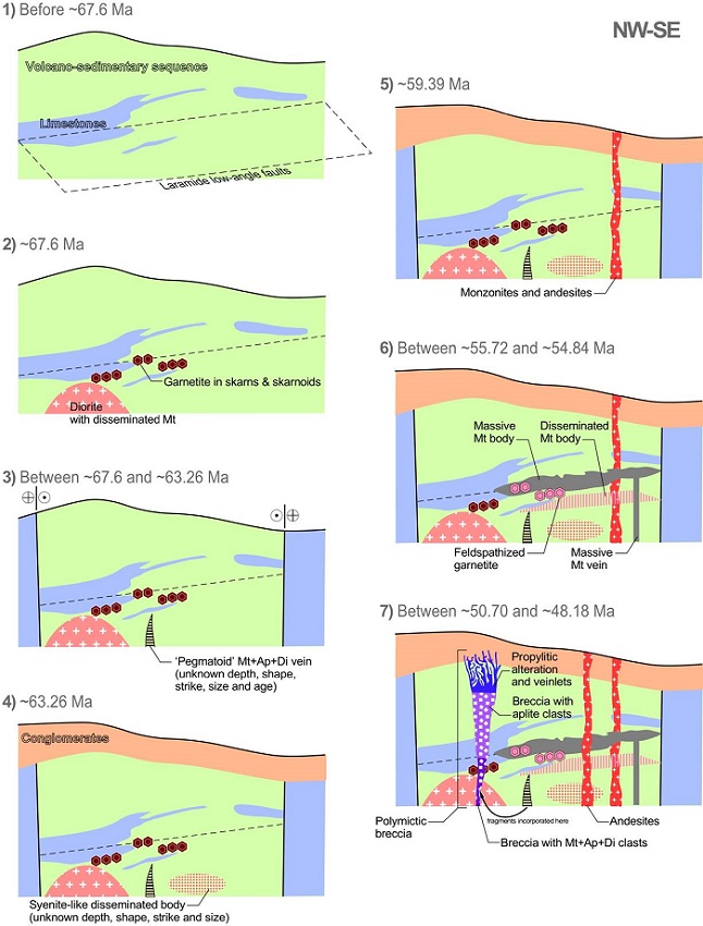 The events that led to the formation of the multi-stage Peña Colorada and Arrayanes magmatic-hydrothermal iron oxide (MHIO) deposits began in the latest Cretaceous (Maastrichtian) and ended in the earliest Eocene (Ypresian). These deposits are bracketed by the age of their purported initial “parental” diorite intrusive at 67.6 ± 3.5 Ma and the youngest age of potassic alteration associated with the polymictic breccia at 48.18 ± 0.16 Ma (Figure 17 and Table 4). All the major mineralization events were apparently predated by neighboring magmatic events that include diorites or gabbros, and also by changes in strike of structural styles (Figures 8 and 9), or changes in the dominant stress fields regionally. The ages of such structural, magmatic, and mineralizing events overlap within the ranges of uncertainty of the available ages (Figure 17 and Table 4), and thus they can be grouped into the following episodes: