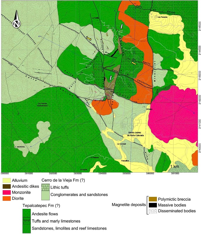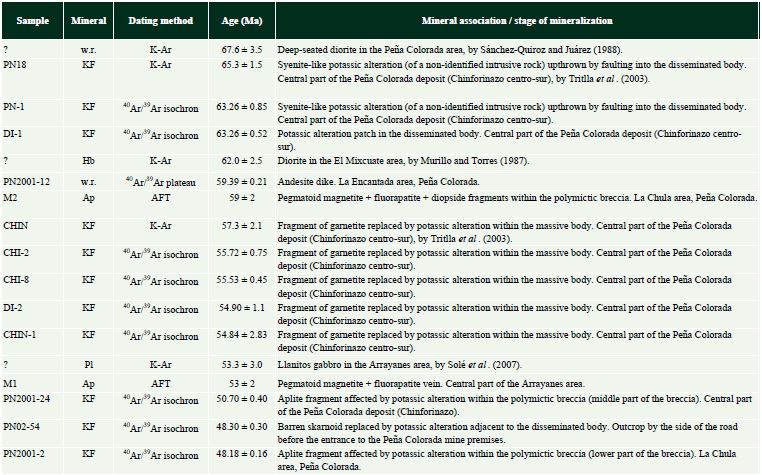 Sound genetic studies in the Peña Colorada deposit have been carried out by Zürcher et al. (2001) and Tritlla et al. (2003), and additional genetic aspects were provided by Corona-Esquivel and Henríquez (2004) and Camprubí and Canet (2009). These studies provide evidence for links between magmatism, hydrothermal activity, and the formation of IOA deposits. However, key aspects of the mineralization deserve further attention: (1) ages of the stages of mineralization and a clear temporal sequence for all key geological aspects, (2) the association of mineralization with the structural evolution in the region and the structural framework for the emplacement of mineralized bodies, and (3) the study of petrogenetically relevant compositions of major minerals in order to better constrain the genesis of these deposits.