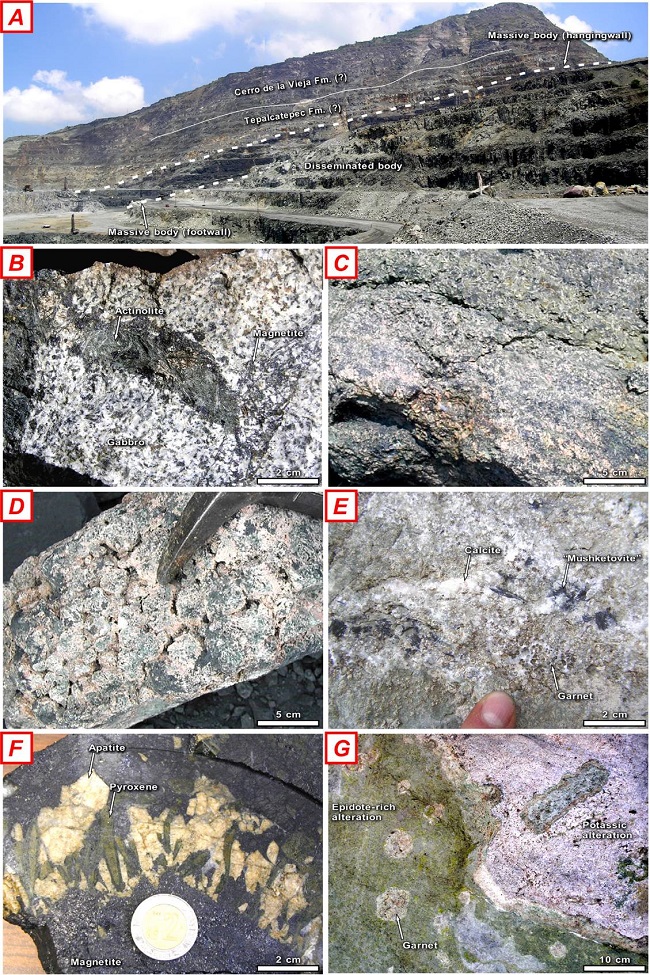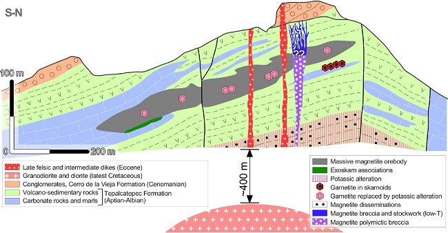 The sequence of mineralization events in the Peña Colorada iron oxide-apatite (IOA) deposit is the result of several intrusion and hydrothermal mineralization events: (1) intrusion of the Peña Colorada diorite, formation of garnetites as skarns or skarnoids, and formation of the syenite-like disseminated body; (2) intrusion of monzogranite and andesite dikes and of the neighboring El Mixcuate diorite, and formation of the main disseminated and massive iron oxide bodies (both semi-stratabound bodies and veins); and (3) intrusion of the neighboring magnetite-rich Llanitos gabbro and the associated diorite and microgranodiorite, and formation of the polymictic breccia. All the IOA ore bodies in the neighboring Arrayanes prospect appear to be associated with the sole intrusion event that comprises the Llanitos gabbro and its associated rocks. Such intrusive rocks have complex relations among them that can be associated with mixing or mingling processes. These intrusive rocks carried magmatic magnetite, which is visibly widespread as disseminations in the entire Arrayanes prospect, though significantly concentrated along mingling zones between gabbros and diorites. The occurrence of magnetite as a magmatic mineral within similar rocks was already noticed by González-Reyna (1956) in the diorite hypabyssal body in the southern part of the Peña Colorada area, now mostly concealed by mining activities in the area.