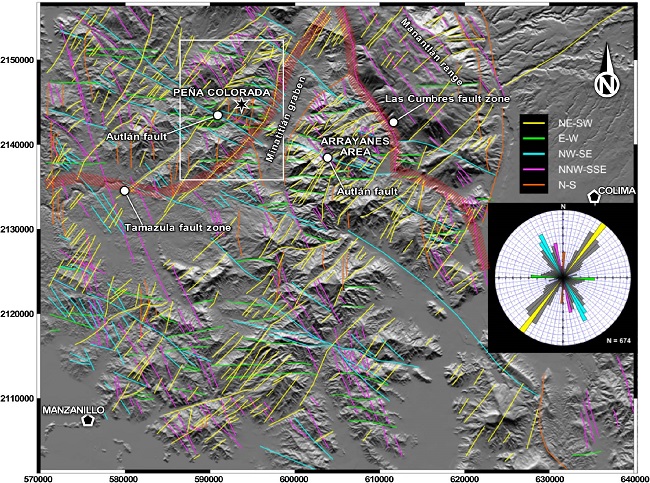 The Peña Colorada deposit and the Arrayanes prospect are found in horsts that formed to the west and east, respectively, of the NE-SW striking Minatitlán Graben, and both are limited to the south by the regional WNW-ESE Autlán Fault (Figures 8 and 9A). The regional rosette (Figure 8, inset) shows concentration peaks for five structural domains that strike N-S, NNW-SSE, NW-SE, E-W, and NE-SW. The highest concentration of alignments corresponds to NE-SW strikes, then NW-SE, NNW-SSE and E-W strikes, and finally N-S strikes. Both the concentration of alignments and the continuity/discontinuity of structures constitute qualitative criteria for assessing the relative timing of structures. The oldest structural domains correspond to N-S and NNW-SSE strikes, and these show lower concentrations than the rest, as defined by their length. It is likely that their distribution was altered by later structures by means of linear or rotational displacements, thus limiting their strike length. Further, N-S and NNW-SSE structures were reactivated at least once and they have induced displacements of later structures during such reactivation(s), which added complexity to the already intricate structural pattern; such is the case of the La Encantada fault in the Peña Colorada mine. Zürcher et al. (2001) stated that the oldest structures at Peña Colorada strike N-S, a finding we corroborated by detailed structural analysis and by photointerpretation. The NW-SE structural domain is continuous in its strike length, and displays a high frequency in the rosette (Figure 8).