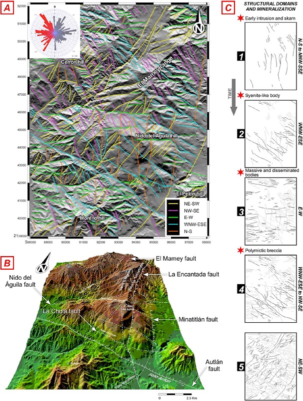 Five structural domains were identified both at regional and local scales: (1) N-S to NNW-SSE, (2) WNW-ESE, (3) E-W, (4) NW-SE, and (5) NE-SW. Domain 1 at Peña Colorada predated the syenite-like disseminated mineralization, domain 2 predated the main stage of mineralization (massive and disseminated bodies), and domain 3 predated the polymictic breccia. It is possible that the location of this deposit was determined by reactivated faults in the basement, as it occurs near two major basement-derived fault zones; further research that assesses such possibility would be required.