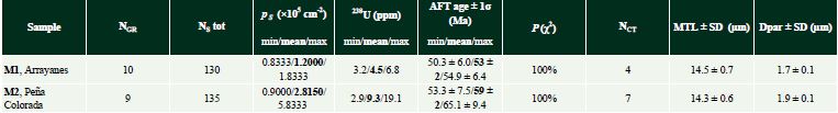 AFT dating results are listed in Table 2 and Appendix 2 in Supplementary Material, and displayed in Figure 14. Both samples M1 and M2 passed the chi-squared probability test (Table 2), which indicates that all the analyzed apatites belong to a single population of ages (Galbraith, 1981). Sample M1 yielded the pooled age of 53 ± 2 (1σ) Ma (Arrayanes magnetite plus apatite veins) (Table 2, Figure 14). Sample M2 yielded the pooled age of 59 ± 2 (1σ) Ma (Peña Colorada magnetite plus apatite plus pyroxene veins) (Table 2, Figure 14). Apatites from the studied rocks have the Dpar values (Donelick et al., 2005) from 1.7 ± 0.1 (1σ) µm to 1.9 ± 0.1 (1σ) µm (Table 2). Thus, the effective closure temperature for these apatites can be taken as 110 to 120 °C. Apatites from two samples give approximately similar mean confined track lengths of 14.5 ± 0.7 (1σ) µm and 14.3 ± 0.6 (1σ) µm, which closely correspond to volcanic-type cooling (Gleadow et al., 1986). This suggests that the samples were cooled rapidly through the partial annealing zone of approximately 60° to 120 °C.