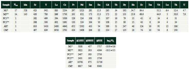 Average REE concentrations in fluorapatite are displayed in Table 3 and Figure 14, and individual analyses in Appendix 3 in Supplementary Material. Oxygen fugacity (fO2) was calculated using Mn concentration of apatite and based on the linear equation proposed for silicic magmas by Miles et al. (2014). The values of log fO2 vary between -10.9 ± 0.6 and -10.1 ± 0.5 (Table 3), indicating that the apatites crystallized in high oxidation conditions, in close agreement with EPMA results. ΣLREE (La, Ce, Pr, Nd, Sm, and Eu) values in the analyzed samples range between 2407 and 10761 ppm and ΣHREE (Gd, Tb, Dy, Ho, Er, Tm, Yb, and Lu) values range between 303 an 975 ppm. Both ΣLREE and ΣHREE values are found within the compositional range determined by Mao et al. (2016) as characteristic for IOCG and Kiruna-type deposits. Similar to EPMA analyses (see above), the Ce contents in fluorapatite obtained by LA-ICP-MS are significantly higher in this deposit than in other magmatic-hydrothermal iron oxide deposits (and several other types of deposits ): Ce/Ce* values (Lodders, 2010, in Mao et al., 2016) in the Peña Colorada deposit and the Arrayanes prospect are between 4 and 5. Conversely, Eu contents in fluorapatite in this study are lower than in other magmatic-hydrothermal deposits of either type: Eu/Eu* values (Lodders, 2010, in Mao et al., 2016) in the Peña Colorada deposit and the Arrayanes prospect are between 0.03 and 0.09. Mn versus Sr and Y versus Sr contents in fluorapatites agree very well with those of other iron ores (compare data in Appendix 3 in Supplementary Material with figures 4a-b in Belousova et al., 2002), which is not the case for Y versus Eu/Eu* values due to the low Eu content in the fluorapatites.