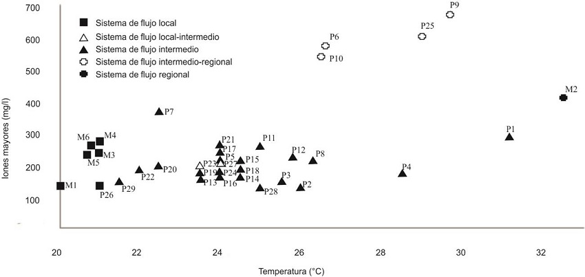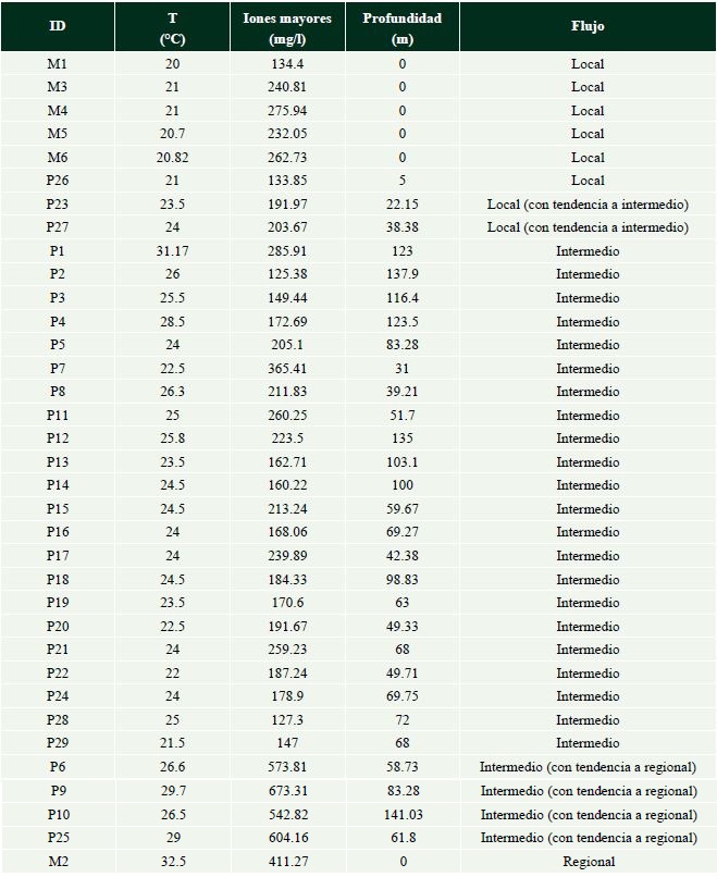 Para identificar los sistemas de flujo se consideraron tres parámetros, que incluyen la temperatura, los iones mayores y la profundidad del agua subterránea (nivel estático). Estos tres parámetros han sido señalados en diversos estudios donde se caracterizan los sistemas de flujo de agua subterránea (Carrillo-Rivera et al., 1996; Cardona, Carrillo-Rivera, 2006; Mahlknecht et al., 2006; Carrillo-Rivera et al., 2007; Fagundo-Castillo et al., 2014; Huizar-Alvarez et al., 2016). Tóth ilustra como los parámetros de temperatura, contenido de iones mayores y profundidad cambian en los sistemas de flujo conforme estos circulan y evolucionan en su naturaleza local, intermedia o regional (Tóth, 1999).