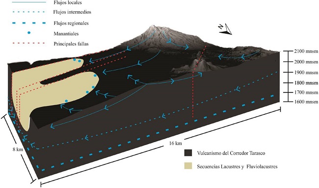 En la zona Morelia-Capula, los límites de contacto entre materiales volcánicos y fluviolacustres están definidos por las fallas geológicas, por lo que la geología estructural está jugando un papel central en la dinámica de los sistemas de flujo de agua subterránea, lo que genera zonas de afloramiento de manantiales o actuando como canales de interconexión de flujos profundos con superficiales.