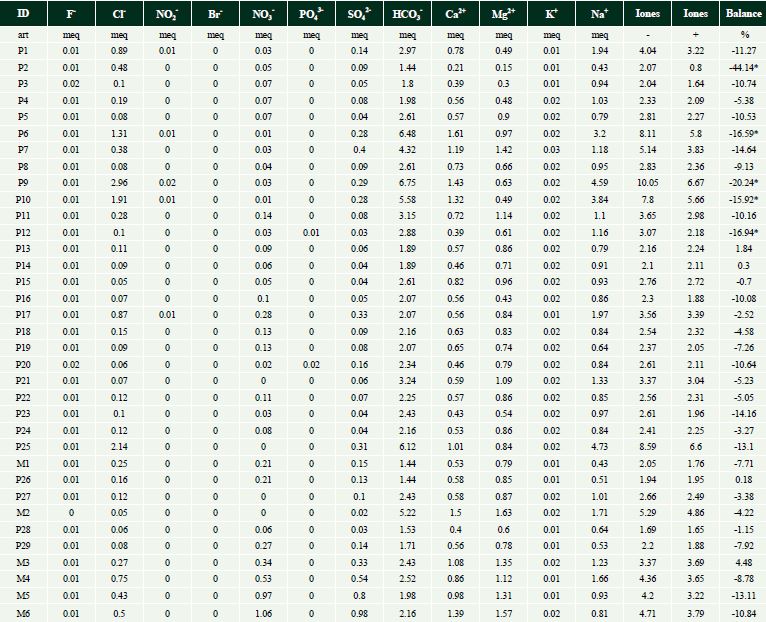 Los análisis químicos de las muestras de agua subterránea se presentan en la Tabla 1, en la que se observan muestras que sobrepasaron el 10 % de error en el balance iónico, lo cual se asocia a un error en la medición del potasio. En la Tabla 2 se presentan los datos de temperatura, iones mayores y profundidad (nivel estático) del agua subterránea de los sitios de estudio. Los pozos presentaron valores promedio de temperatura de 24.92 °C, con un valor mínimo de 21.00 °C y un máximo de 31.17 °C, mientras que los iones mayores tuvieron una media de 252.19 mg/l, con un mínimo de 125.38 mg/l y un máximo de 673.31 mg/l. Los manantiales tuvieron una temperatura promedio de 22.67 °C, siendo el valor mínimo de 20.00 °C y el máximo de 32.50 °C. La media de iones mayores fue de 259.53 mg/l, con un valor mínimo de 134.40 mg/l y un máximo de 411.27 mg/l.