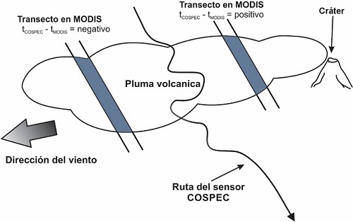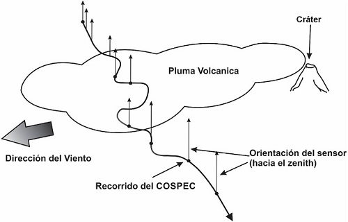 Las mediciones del flujo de SO2 volcánico, utilizando sensores de percepción remota, inició a mediados de los años setenta con el uso del Espectrómetro de Correlación (COSPEC, por sus siglas en Inglés) (Stoiber et al., 1983). El COSPEC es un sensor que utiliza la radiación ultravioleta entre 300 y 330 nm dispersada por la atmósfera como fuente de radiación. Puede ser utilizado de forma fija para medir los gases de salida del cráter del volcán o se puede montar en un vehículo terrestre o aéreo para la realización de medición en transectos de la pluma. Stoiber et al. (1983) calcularon el error relativo de las mediciones de COSPEC entre valores de ±13% y ±42%, los cuales incluyen errores tanto instrumentales como metodológicos. En este estudio, se obtuvieron mediciones de COSPEC desde un vehículo terrestre el cual estima las concentraciones de SO2 tomando mediciones verticales en transectos que cruzan la pluma volcánica como se observa en la Figura 1. La concentración media de la sección tomada de la pluma es multiplicada por la velocidad de la pluma para determinar el flujo de SO2 de la emisión.