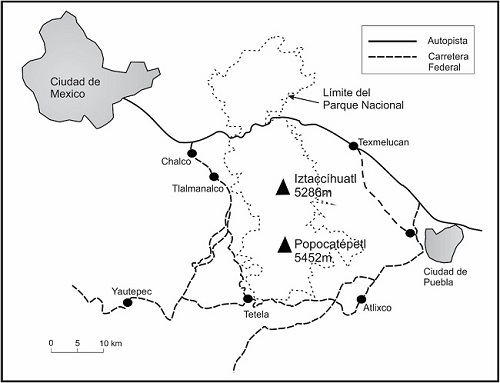 Debido al principio de detección del sensor COSPEC, es importante considerar las condiciones de luz solar para determinar el mejor momento para llevar a cabo las mediciones. Para el caso del volcán Popocatépetl, el mejor momento para realizar las mediciones con COSPEC se presenta entre las 10:00 y 14:00 hora local (Delgado-Granados, 2008). Es durante este tiempo que los transectos de la pluma volcánica son obtenidos al pasar al sensor por debajo de ésta. Para lograrlo, es necesario seguir varios caminos que rodean el volcán dado que la dirección de la pluma puede presentarse en varias direcciones a lo largo del año. Como se muestra en la Figura 2, el sistema de carreteras que rodean al volcán permite llevar acabo mediciones en cualquier dirección que presente la pluma.