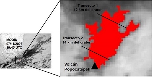 La Figura 4 muestra los transectos de las mediciones hechas con COSPEC estimados en la imagen MODIS adquirida el 7 de noviembre de 2006. Los datos obtenidos en cada uno de los transectos individuales se muestran en la Tabla 1. Para el caso analizado anteriormente, se puede observar que uno de los transectos medido por COSPEC se realizó a las 18:39 UTC (tiempo medio de la medición) a una distancia de 34 km del cráter. La imagen MODIS se obtuvo a las 19:45 UTC lo que representa un Δt de 66 minutos. Debido a que la medición COSPEC se obtuvo antes de la imagen MODIS, la zona medida por COSPEC sobre la pluma se encontrara desplazada por el viento alejándola del cráter durante este Δt con una velocidad reportada de 2 m/s. Como se muestra en la Figura 4, el transecto se estimó en la imagen MODIS a 42 km del cráter del volcán. El segundo transecto tomado por COSPEC se obtuvo después de la imagen MODIS, por lo que en esta ocasión se considera que esta sección de la pluma se encontrara más cerca del cráter en la dirección del desplazamiento del viento. El transecto medido por COSPEC se localizó a 29 km del cráter del volcán en este caso se estimó una velocidad del viento superior de 4 m/s, lo que originó que el transecto de COSPEC sobre la imagen MODIS se ubicara a 14 km del cráter del volcán.