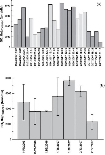 La Figura 5b muestra que los valores del flujo de SO2, estimados por medio del sensor COSPEC, durante el periodo de estudio se encontraron entre un mínimo de 2300 ton/día y un máximo de 7600 ton/día. Durante este periodo de noviembre de 2006 a febrero de 2007, se llevaron a cabo 7 días de medición, lo que representa un ~6% de tiempo cubierto con mediciones de flujo de SO2 con el sensor COSPEC. Esto es debido a las dificultades logísticas para llevar a cabo las campañas de medición con COSPEC, por lo que en la actualidad se realizan una o dos campañas de medición al mes. Además, como ya se había mencionado, es posible obtener información sólo con luz de día, restringiendo aún más los intervalos de tiempo para vigilar el volcán por este método.