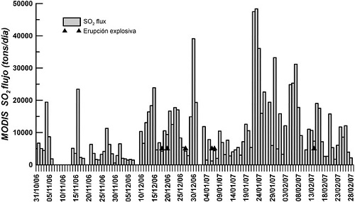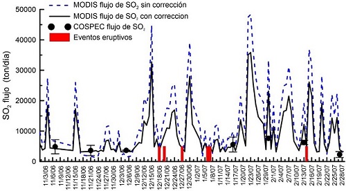 En los datos presentados en este estudio, se puede observar que desde comienzos de diciembre y hasta finales de febrero, no se habían llevado a cabo mediciones del flujo de SO2 para el monitoreo de la actividad del volcán Popocatépetl debido a la falta de presupuesto al final del año y la llegada tardía del presupuesto del siguiente año. Esta es una de las razones por la cual se necesita contar con herramientas alternativas que permitan el uso de información de bases de datos de imágenes satelitales. En el presente trabajo, las estimaciones MODIS de las tasas de emisión de SO2 muestran altos valores a finales de 2006 y principios de 2007. A principios de diciembre de 2006, los registros del Centro Nacional de Prevención de Desastres (CENAPRED), muestran que hubo un terremoto volcanotectónico seguido de eventos de largo período de amplitudes variables acompañados de temblores volcánicos en las siguientes fechas. El 6 de enero de 2007, el temblor armónico se observó antes de una explosión que arrojó fragmentos balísticos a los alrededores del volcán. Se produjo un temblor más armónico en los días siguientes y cesaron el 14 de enero. Sin embargo, el 25 de enero hubo otra explosión similar a la del 6 de enero. Esta última explosión ocurrió en el pico de emisión de gases medida por la imagen MODIS en un período en el que no se realizaron mediciones COSPEC entre el 22 y el 27 de enero. La metodología presentada en este trabajo para explotar las imágenes MODIS fue crucial para entender estos eventos. La información sísmica no está incluida porque está fuera de los objetivos de este documento.