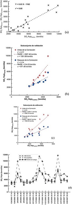donde x representa el flujo de SO2 estimado utilizando imágenes MODIS en toneladas por día. Tanto para los subconjuntos de calibración como para los de validación, la aplicación de la ecuación (6) para corregir las estimaciones MODIS reduce el RMSE y la desviación estándar (ver figuras 7b y 7c). En ambos casos, el RMSE se reduce en un 33% y la desviación estándar mejora en un 40% en comparación con las estimaciones MODIS originales. Observamos que esta ecuación puede aplicarse para corregir las estimaciones de MODIS con el fin de acercarlas lo más posible a las observaciones COSPEC cuando la diferencia entre los sensores oscila entre 65 y 5240 ton/día. Para las diferencias superiores a 5240 ton/día, la ecuación necesita ser revisada con una base de datos más amplia y una nueva ecuación podría ser requerida. La Figura 7d compara las estimaciones de COSPEC, MODIS y MODIS después de eliminar el sesgo mediante el uso de la ecuación (6) para la base de datos completa. Se observa que las estimaciones del flujo de SO2 de las imágenes MODIS corregidas de sesgo son más cercanos a los valores del flujo de SO2 estimados de las mediciones de COSPEC y ambos sensores representan una tendencia similar en el tiempo. Particularmente, los picos obtenidos por MODIS redujeron su amplitud para estar en el orden de magnitud de COSPEC.