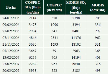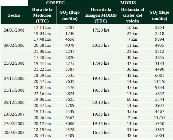 Se considera que los valores obtenidos de los transectos de la pluma tomados por COSPEC son comparables a los valores de estos transectos obtenidos en las imágenes MODIS. Por lo que, si ahora se considera el cálculo del flujo promedio en la pluma completa tomada en la imagen MODIS tendremos una aproximación más real con las variaciones del flujo en el volcán. Para estimar el flujo diario de SO2, se promedian los valores de flujo total obtenido en cada imagen MODIS de ese día. La Tabla 2 muestra la comparación entre los valores promedio diario de los flujos obtenidos con COSPEC y las imágenes MODIS para los días en que la información está disponible para ambas metodologías (enero, febrero, noviembre y diciembre de 2006, enero, febrero y marzo de 2007). Es importante mencionar que mientras los datos de COSPEC en cada medida mostrada en la Tabla 2 se obtuvieron en un periodo de 3-5 horas, la instantánea de una imagen MODIS puede representar el gas emitido durante 5-10 horas con una visión general del evento, teniendo en cuenta variaciones en el flujo que no pueden ser detectadas con COSPEC.