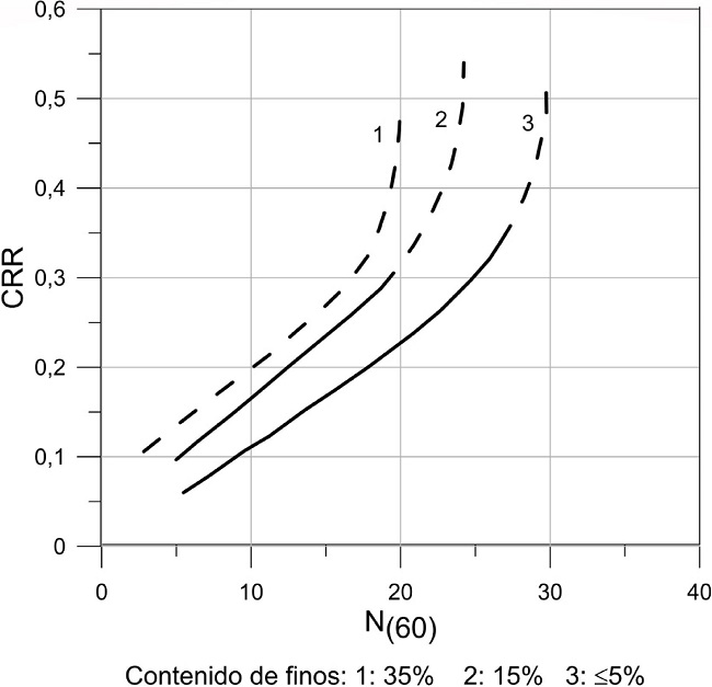 CRR valor de resistencia a la licuación. Cociente de tensiones (Figura 1) que causa licuación en arenas limpias y limosas, y el golpeo SPT normalizado para una energía útil del 60% de la nominal y a una presión efectiva vertical de 100kPa, N(60), definido según se indica a continuación.