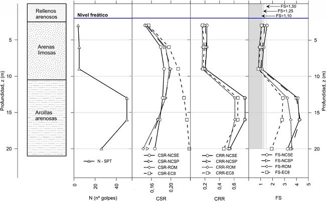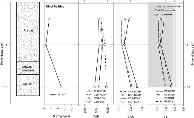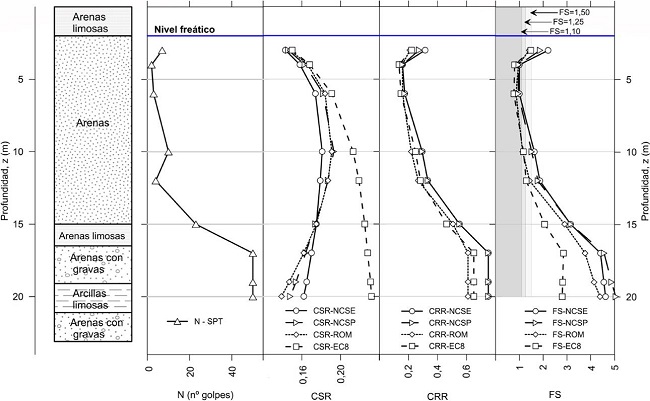 La columna litológica y los resultados del ensayo de penetración estándar (SPT) se muestran en la Figura 8. En la misma figura se han representado también los valores en profundidad de CSR, CRR y el factor de seguridad obtenidos como el cociente entre los dos parámetros anteriores para las tres normativas consideradas.