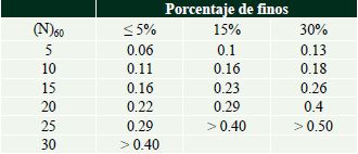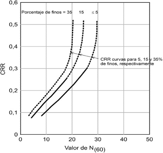 Por otro lado, CRR viene expresada tanto en forma gráfica (Figura 2) como en una tabla en función del porcentaje de finos del suelo (Tabla 4).