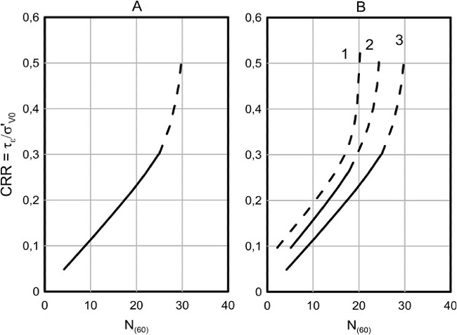 En el EC-8 se incluyen también unas curvas empíricas que son correlaciones entre valores del SPT normalizado N(60) y tensiones tangenciales cíclicas (CSR) que han producido licuación en terremotos anteriores, normalizada por la presión efectiva inicial (σ’V ). Estas curvas se incluyen en la Figura 3.