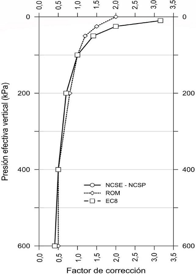 En las cuatro normas el parámetro CRR puede determinarse a partir de una figura en función del ensayo SPT corregido. Estas figuras son similares en todas las normas, si bien existen ligeras diferencias entre ellas. La corrección del SPT es idéntica en la NCSE-02 y EC-8, pero ligeramente diferente tanto en la NCSP-07, donde cuenta con un factor de longitud de varillaje y otro por diámetro del sondeo, como en la ROM 0.5-05 donde el factor de corrección está tabulado en función de la presión efectiva, y no es completamente concordante con la función continua indicada en las otras normas. En la Figura 5 se muestra este factor en función de la presión efectiva vertical. En todas las normas se obtiene el mismo factor de corrección para una presión de 100 kPa. Sin embargo, por ejemplo, para una presión vertical de 25 kPa el factor obtenido para la NCSE y NCSP es un 33% superior al obtenido mediante la ROM.
