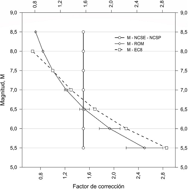 Otra diferencia entre las normas es el factor de corrección para terremotos de magnitud (M) diferente a 7,5. Las normas ROM 0.5-05 y EC-8 cuentan con este factor tabulado (Tablas 3 y 4, respectivamente), si bien los valores son algo diferentes entre sí. La NCSE-02 y la NCSP-07 cuentan por su parte con un factor KM en función del coeficiente de contribución, coeficiente definido en la norma según la situación geográfica considerada y que tiene en cuenta la influencia de los distintos tipos de terremotos esperados según la peligrosidad sísmica de cada zona. Este factor es equivalente al factor de corrección por magnitud del sismo de las otras dos normas y toma un valor de 1,5 para gran parte del territorio español, excepto en algunos términos municipales de Andalucía y Extremadura donde alcanza un valor mínimo de 0,51.