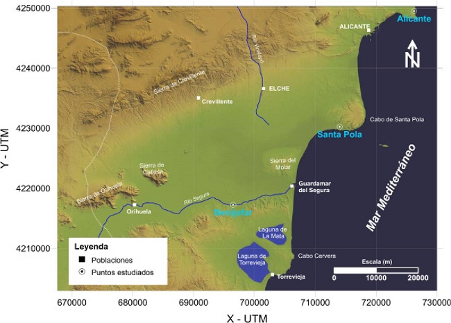 Con objeto de evidenciar las diferencias entre las cuatro normativas estudiadas, se propone cuantificar el factor de seguridad y el potencial de licuación a través del estudio de tres emplazamientos reales situados en los términos municipales de Benijófar, Alicante y Santa Pola, todos ellos en la provincia de Alicante (Figura 7).