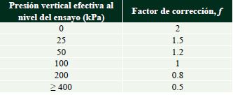 La corrección del valor del ensayo SPT es análoga a la utilizada en la NCSE-02, si bien se indica que para profundidades inferiores a 3 m los valores medidos en el ensayo SPT se deberán reducir un 25%, y que el valor de la corrección por σ'v debe estar comprendido entre 0,5 y 2,0.