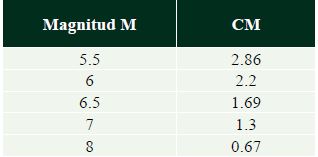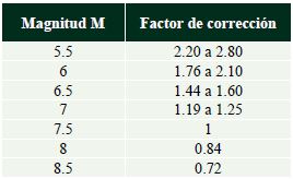 Los valores anteriormente indicados están obtenidos para terremotos de magnitud (M) igual a 7,5. Cuando el terremoto es de una magnitud diferente deben utilizarse los factores de corrección indicados en la Tabla 5.
