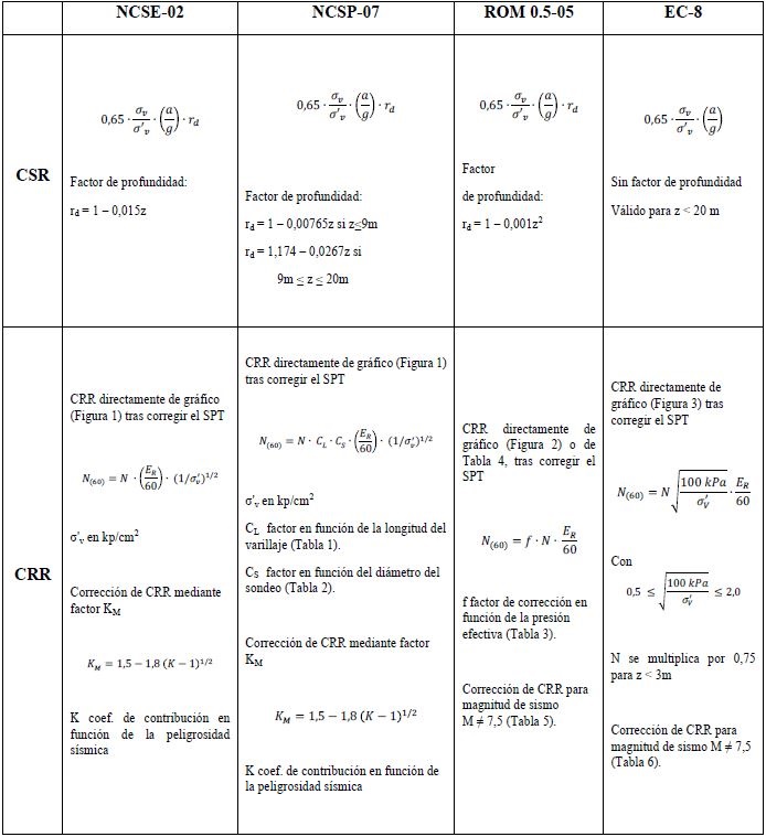 Se homogenizará la nomenclatura empleada con objeto de poder realizar la comparación entre las cuatro normativas de una forma más clara, hablando en todos los casos del valor de resistencia a la licuación (CRR), dividiendo en las normas que consideran la tensión equivalente del terremoto, τe , por la tensión efectiva vertical en el punto considerado. Del mismo modo, se utilizará para la comprobación de la seguridad frente a la licuación, la tensión de corte cíclica adimensional (CSR). En este caso, se dividirá la resistencia del terreno a la licuación de la Norma NCSE-02 y NCSP-07 por la tensión efectiva vertical en el punto considerado.