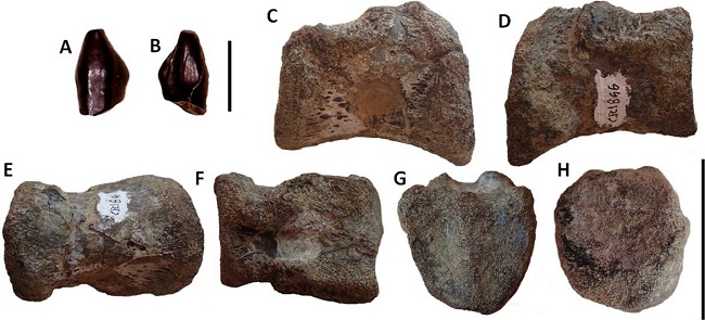 Referred specimens - CPC 1872 (Figure 2, A-B), a right premaxillary tooth; CPC 1866 (Figure 2, C-H), a posterior sacral vertebral centrum.