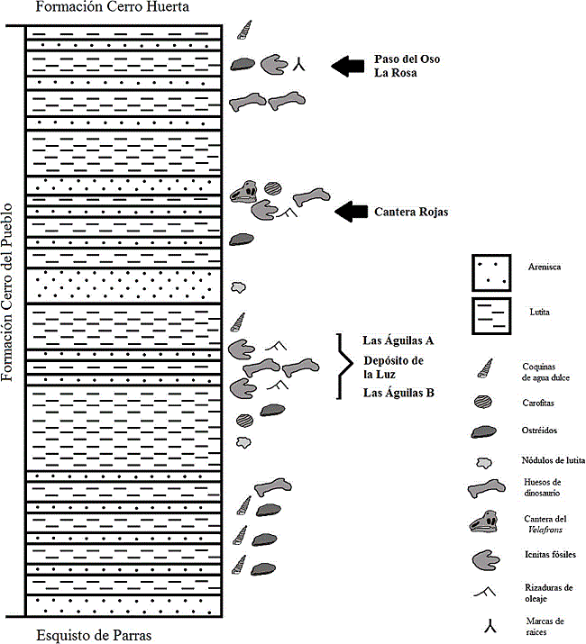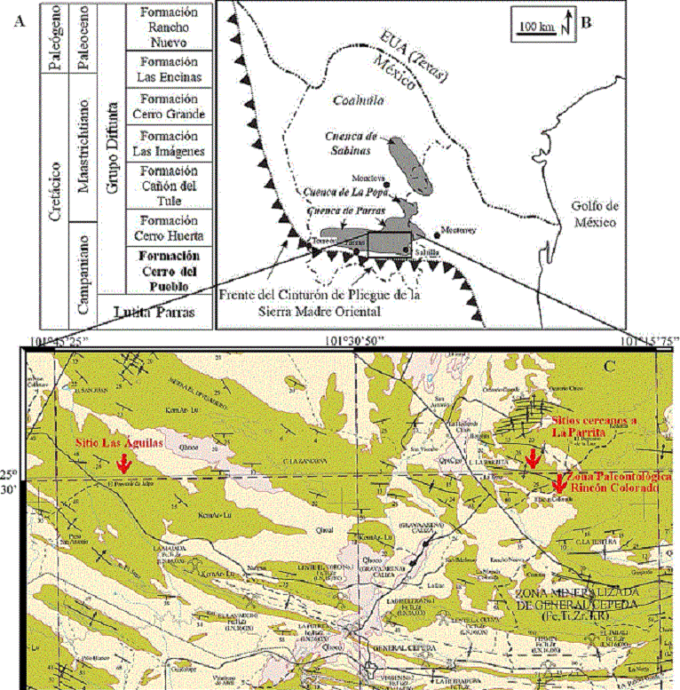 La Formación Cerro del Pueblo (FCdP) es una unidad geológica compleja que conforma la parte basal del Grupo Difunta (Figura 1). De acuerdo con Eberth et al. (2004), esta formación representa una unidad transicional que destaca por la gran diversidad de organismos fósiles que contiene, entre los que se incluyen plantas, protistas, invertebrados y vertebrados, organismos que vivieron en condiciones marinas, salobres y terrestres (Rivera-Sylva et al., 2006; Gates et al., 2007; Perrilliat et al., 2008; Loewen et al., 2010; Bravo-Cuevas y Rodríguez-de la Rosa, 2014). Eberth et al. (2004) ubicaron a la FCdP entre las magnetocronozonas 32n.3r-32n.2n, sugiriendo una edad absoluta máxima de 72.5 millones de años (Campaniano tardío).