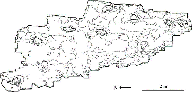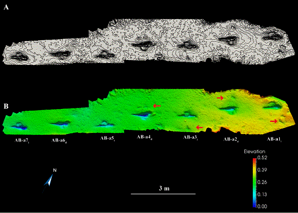 Esta se ubica a 0.35 km al norte de Paso del Oso. Esta localidad incluye nueve icnitas pobremente conservadas que se ubican en el lecho de un arroyo seco de características muy similares al anterior. El yacimiento se modeló con 271 fotografías; la calidad de su reconstrucción fue la menos satisfactoria de las localidades pequeñas, principalmente por las condiciones del sustrato. Fue necesario aplicar un filtro de curvas de nivel al modelo terminado para ayudar a visualizar las icnitas (Figura 12).