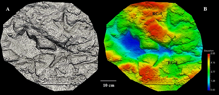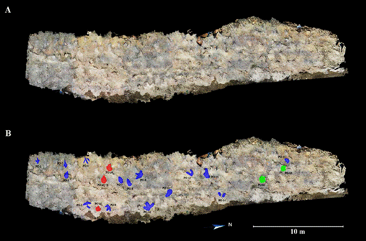 Es el yacimiento más pequeño, se encuentra dentro de la ZPRC y cuenta con cuatro icnitas aisladas en un delgado estrato de arenisca que tiene un área de 26 m2. Los modelos generados de las icnitas individuales, especialmente las más grandes (al centro del yacimiento) presentaron muy buena calidad y detalles finos: se pueden apreciar las marcas de las garras, así como el contorno y la profundidad completa de cada huella (Figura 14). Sin embargo, el modelo en conjunto del yacimiento resultó carecer de la resolución lograda en otras localidades como Depósito de la Luz y Las Águilas B.