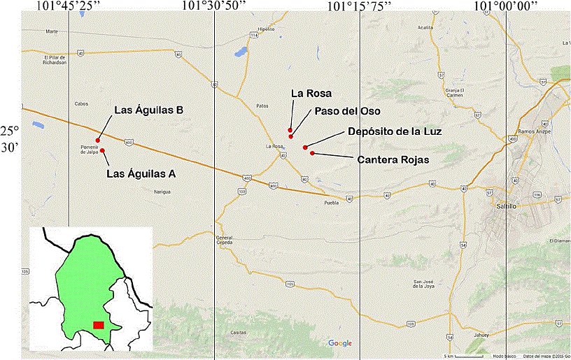 Con base en los datos estratigráficos de las secciones de referencia suplementarias medidas por Eberth et al. (2004) en las zonas de Rincón Colorado y Las Águilas, se realizó un perfil global en el que se establece la posición relativa de los seis estratos fosilíferos estudiados en la FCdP (Figura 2). Todas las localidades están ubicadas dentro del territorio del Municipio de General Cepeda, formando parte de los ejidos Porvenir de Jalpa, La Rosa, Depósito de la Luz y Rincón Colorado (Figura 3).
