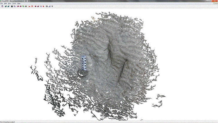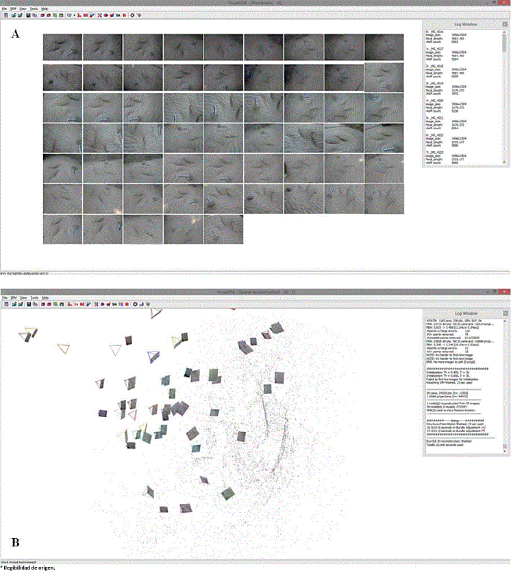 Se empleó el programa VisualSFM por ser un soft ware de acceso libre capaz de generar “nubes de puntos” a partir de fotografías, a partir del método “estructura desde movimiento” (Wu, 2007, 2011). Se cargaron el conjunto de fotografías de la icnita o estrato a reconstruir (Figura 5A) en el programa y este se encargó de comparar cada fotografía con las demás, encontrando puntos en común para generar un mapa vectorial; a este proceso se le denomina sifting por las siglas SIFT (ScaleInvariant Feature Transform) del algoritmo que utiliza. Después de obtener los puntos en común, el programa reconstruyó un mapa tridimensional con las coordenadas de cada uno formando una “nube de puntos dispersa” (Figura 5B).