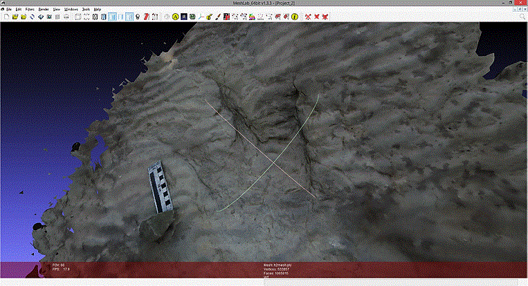 Meshlab (Cignoni et al., 2008) es un sistema de procesamiento y edición de modelos de malla poligonal (polygon mesh). Con este software de acceso libre se convirtieron las nubes densas de puntos generadas en VisualSFM en un sólido poligonal por un proceso llamado meshing. Para realizar este proceso se aplicó el algoritmo de Reconstrucción de Superficie de Poisson (con valores de profundidad de árbol octal de entre 9 y 13, y de divisor de solucionador entre 7 y 8) y los modelos poligonales se texturizaron con las fotografías originales para obtener modelos de alta definición (texturas de 2048 bits).
