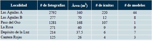 Los modelos obtenidos para las localidades de Las Águilas B, Depósito de la Luz y Cantera Rojas presentaron la mejor calidad; hay que considerar también factores como el reducido tamaño de los yacimientos, que al contener menor número de icnitas facilitó su registro individual.