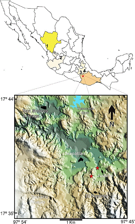 The oldest osteological record of camels from Mexico comes from the late Eocene localities of Yolomécatl, Oaxaca, where Poebrotherium was reported (Jiménez-Hidalgo et al., 2015b). Also, recently collected new postcranial specimens indicate the presence of another camelid taxon in Yolomécatl. These records are to the southeast of Tezoatlán de Segura y Luna.