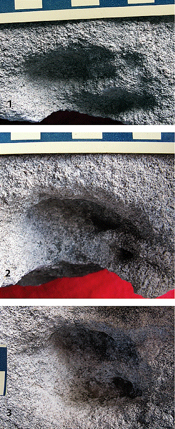 Some ichnites show extramorphological variation, such as a continuous interdigital sulcus (Figure 3.1) or an absent posterior cleft (Figure 3.1). One footprint is smaller and shallower than the others, so, it probably represents an underprint (Figure 3.2).