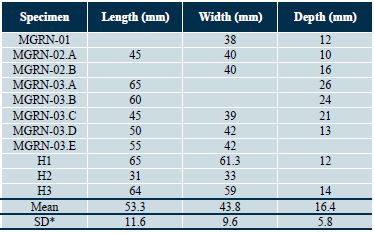 Referred material. MGRN-01, isolated slab with one footprint; MGRN-02, isolated slab with two footprints; MGRN-03, isolated slab with five well preserved footprints. Three footprints preserved in a sandstone bed located near the road to El Naranjo.