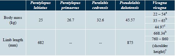 The estimated body mass and limb length of Paratylopus and the estimated body mass of Paralabis make them good candidates as potential producers of the Oaxacan ichnites. Foot structure of Pseudolabis and the observed wide range of body masses of Vicugna, suggest that Pseudolabis cannot be ruled out as potential track maker, at least for the largest imprints.